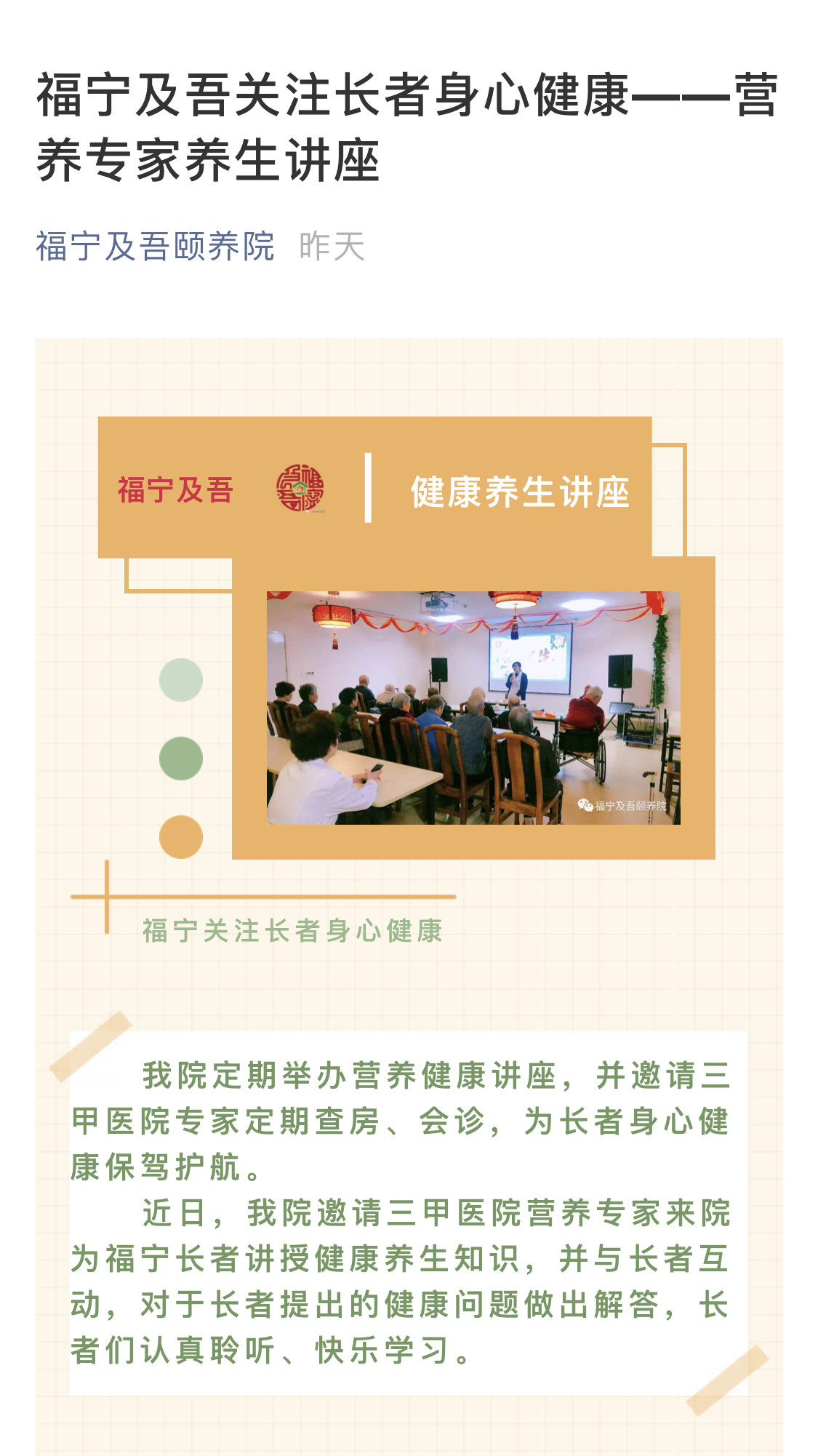 福宁及吾关注每位长者健康——营养专家养生讲座